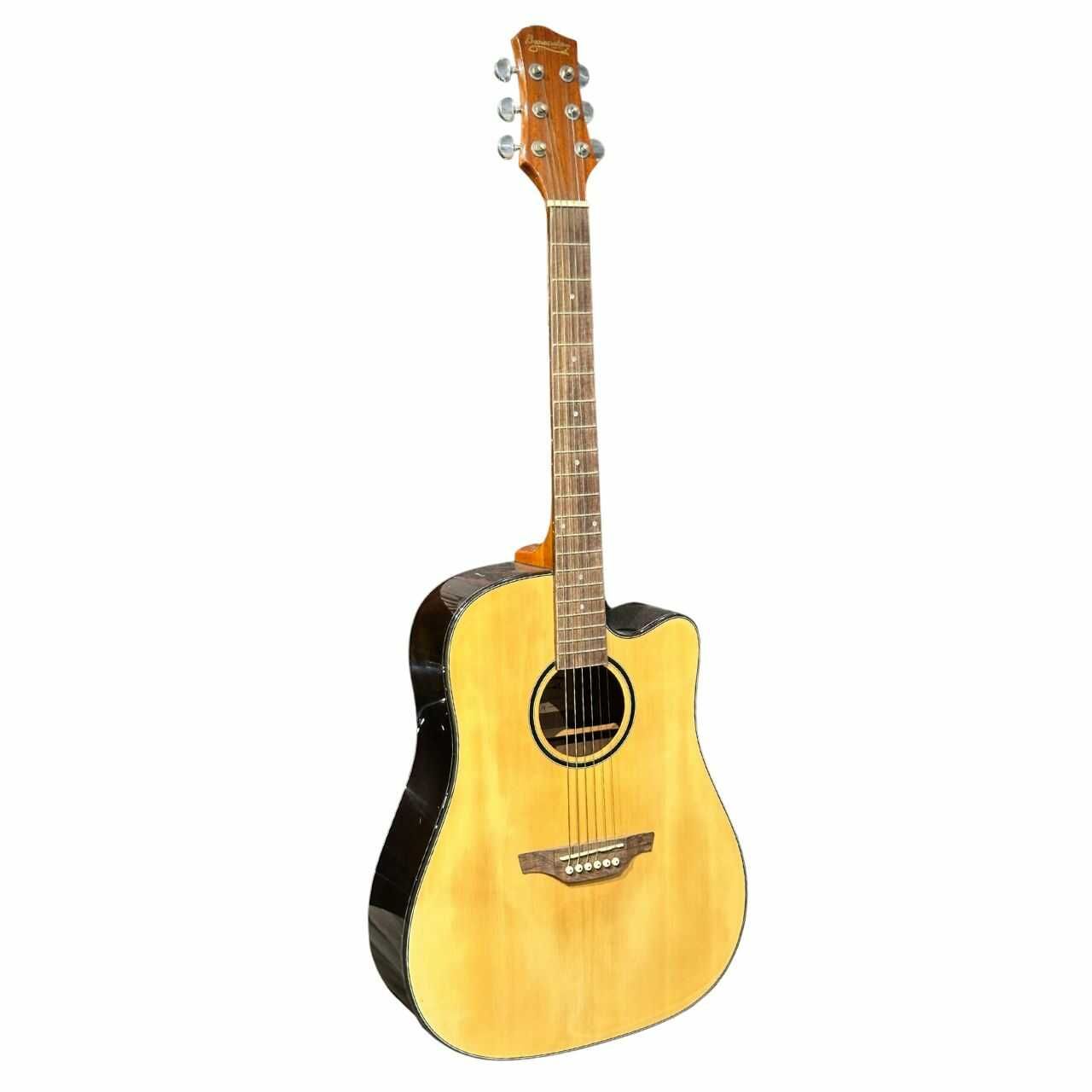 Trọn bộ sản phẩm bao gồm: guitar Baracuda D-400EQ, bao da chống sốc, máy lên dây (string winder), dây Alice A406 và pick chuyên dụng. Thiết kế Cutaway mềm mại, đường viền viền trắng nổi bật trên nền đen bóng của hông–lưng.